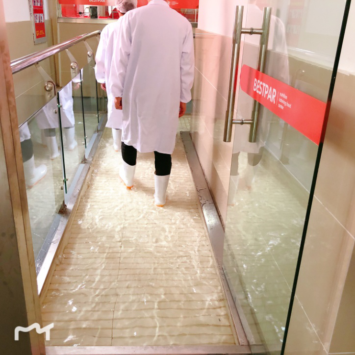 进入制餐中心,体温检测合格后,会进入消毒池,对鞋底进行消毒清洗,保证制餐中心的卫生与整洁。